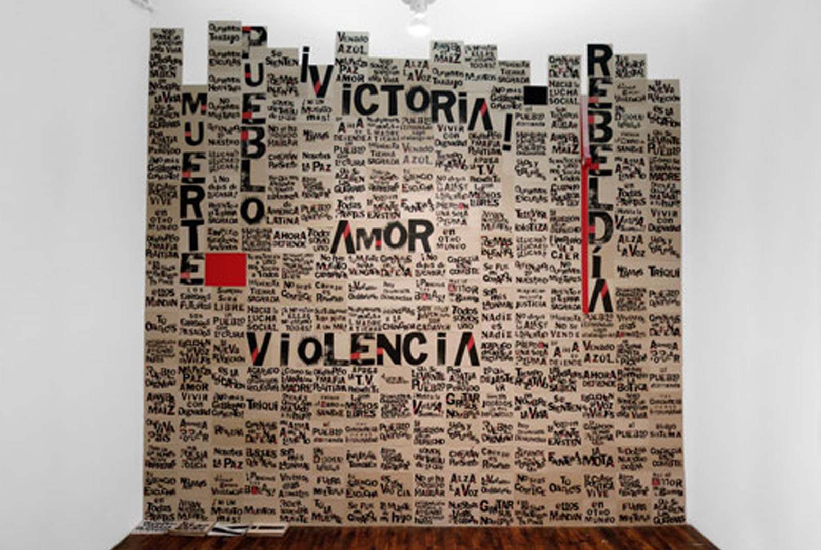 Imagen: Todas las voces (boceto para mural), 2012, 272 fotocopias sobre papel revolución, marcador color rojo, cinta adhesiva roja y masking tape sobre muro, 4.48 x 4.32 mts, Nueva York, EEUU.