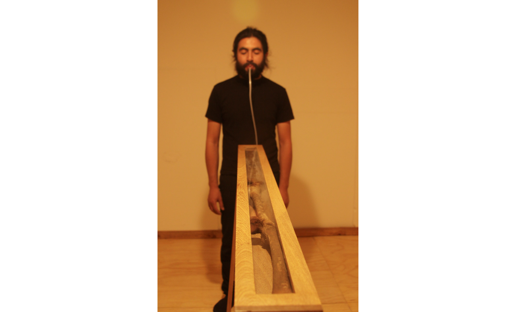 La instalación es una acción sonora en la que el espacio arquitectónico-acústico intervenido de la galería, sirve para el encuentro del artista y los restos humanos de un N.N, el espacio es activado sonoramente por el artista a través de su aliento que por medio de un conducto conduce el aire que sale de sus pulmones hasta una caja hermética donde están depositados los restos humanos, allí se mezcla el aliento con el material óseo, ahora ambas componen una nueva sustancia orgánica, (metáfora de reunión entre flujos de vida y flujos de muerte). De la caja sale otro conducto que dirige el aire hasta una flauta que pende del techo de la sala y que atraviesa el piso enmaderado sobre el cual se soportan la escena, la flauta se activa con el aire y produce sonidos reverberantes que remiten su resonancia al espacio a través del piso flotante que se convierte en una membrana resonante. Los sonidos graves, armónicos y constantes de la acción desata su poder vibratorio y se manifiesta como el componente expresivo que posibilita la unión y relación entre los diferentes elementos constituyentes de la obra.