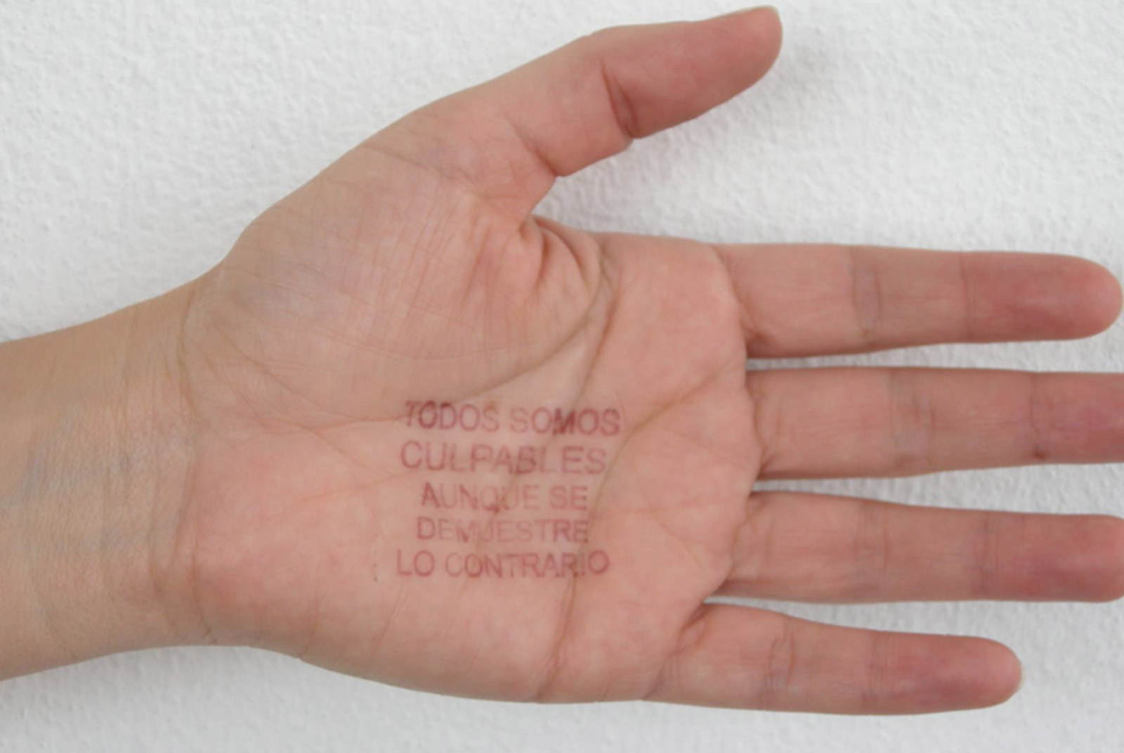 Imagen: Sentencia Indeleble, 2010, aplicación de frase con tinta indeleble (del mismo tipo al usado en las elecciones) por medio de un sello de goma sobre la piel de la mano, 3 x 4.5 cm.