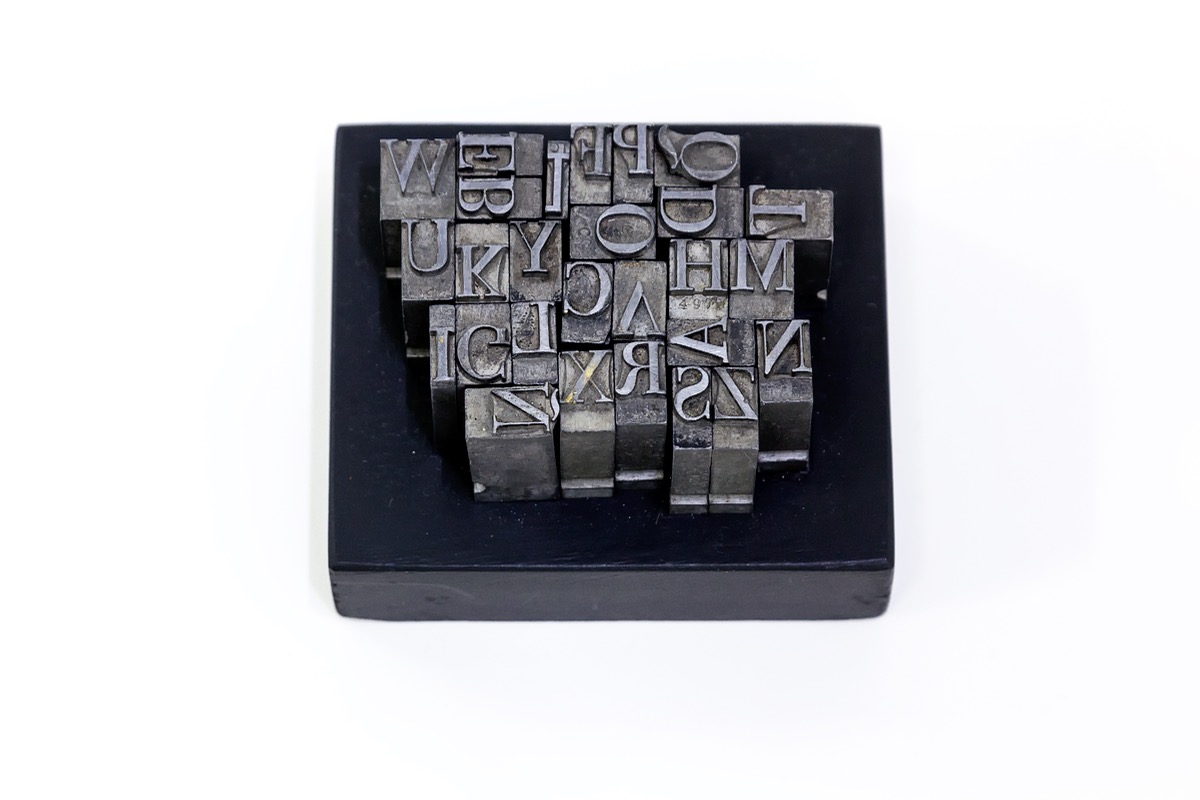 Imagen: Aquí yace toda la poesía, 2015, tipos de imprenta, 7 x 6 x 5 cms.