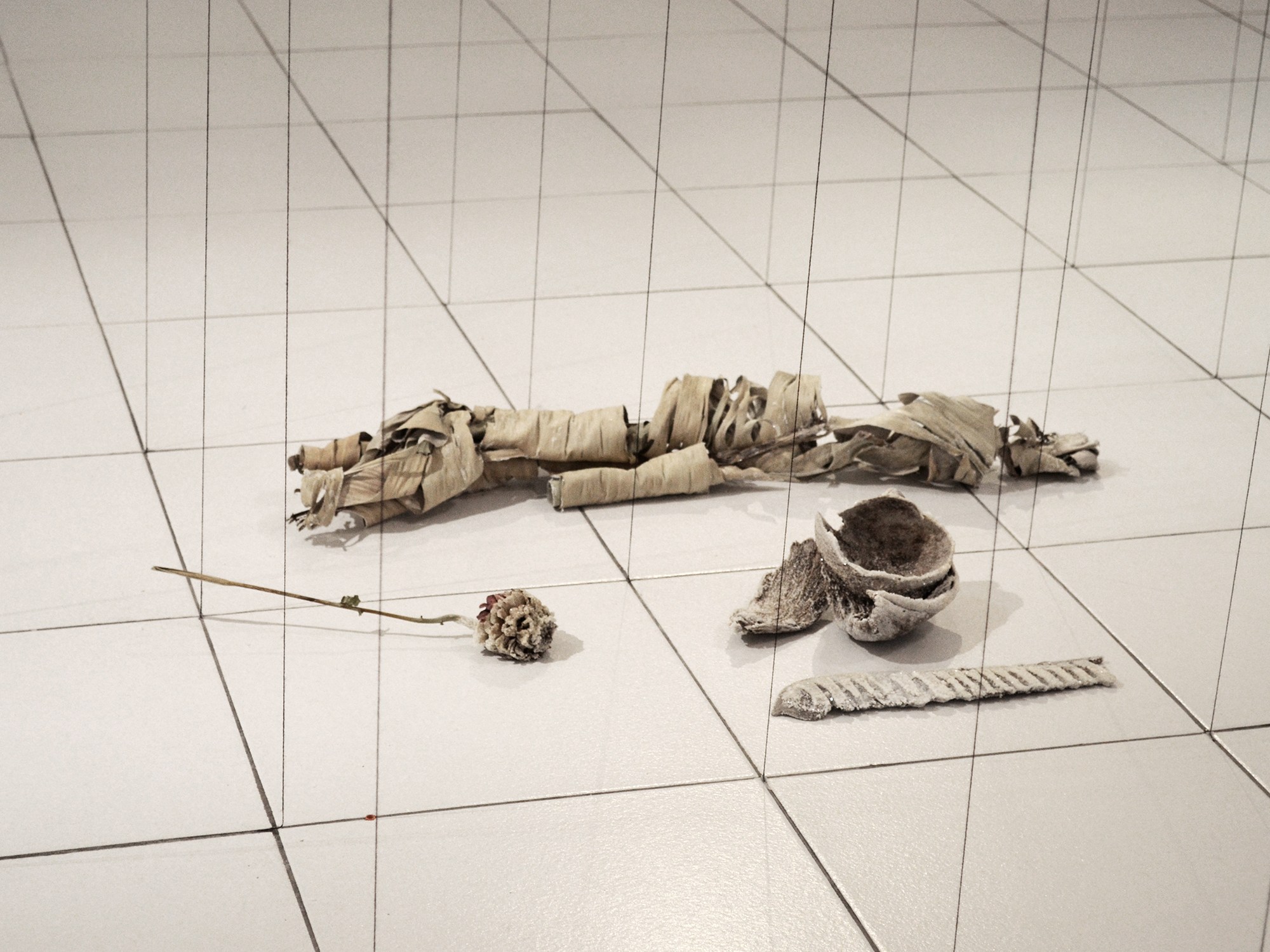 Imagen: The unity is submarine, 2015, instalación con algodón, plantas, hilo, fotografías exposición personal, centro de arte Galeria G, La Garde, Francia.