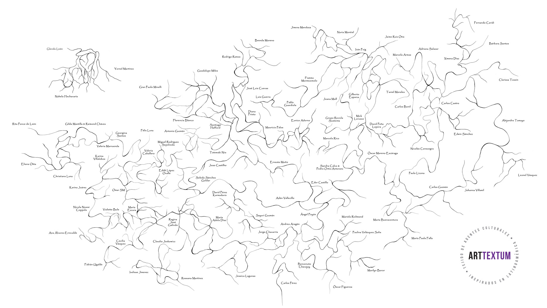 Actualmente, así es como lucen los ríos de gente creativa. El mapa muestra a los 81 participantes junto con los nombres de artistas que están pendientes por responder. // This is a current visualization of the network of connected creative rivers. The map shows the 81 participating artists along with the artists who have yet to be included.